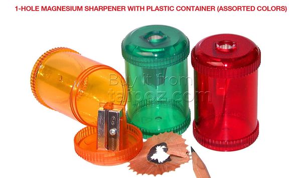 | • Pencil Sharpener, with small waste container. Precision-made of milled magnesium alloy and HCS steel blade. Screw-on top. Assorted colors. • Function: 1-hole sharpener is for normal wooden pencil; 2-hole sharpener for 8mm and 11mm diameter wooden pencil, also for colored pencil, charcoal pencil as the above body diameter range. • Made in Germany.