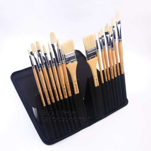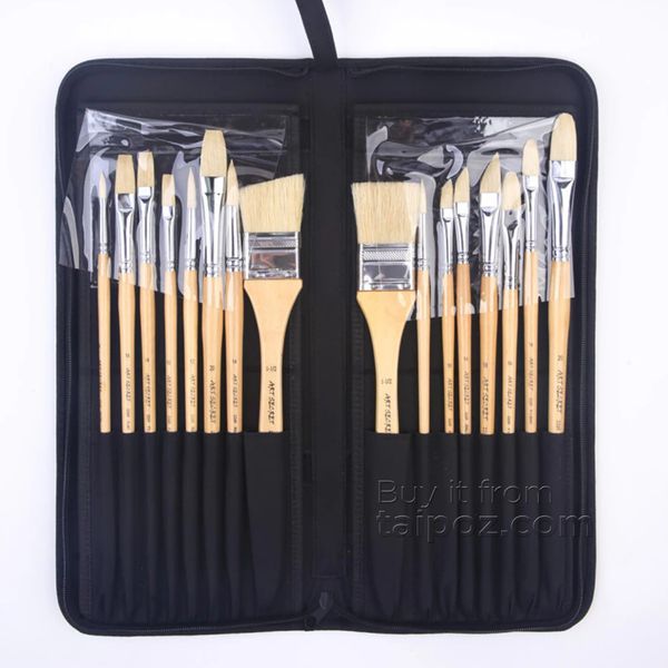 • Set of 16 brushes of all shapes and sizes, used for acrylic and oil paints. Versatile, convenient and complete for those who are just starting to practice drawing with a desire to have a good quality brush set, or those who often draw outdoors. • Chungking hog bristle material, strong and durable, ideal for brushstroke. Selected design suitable for landscape, impressionist and abstract painting styles. • Fabric carrying bag, which folds up vertically for easy brush access.