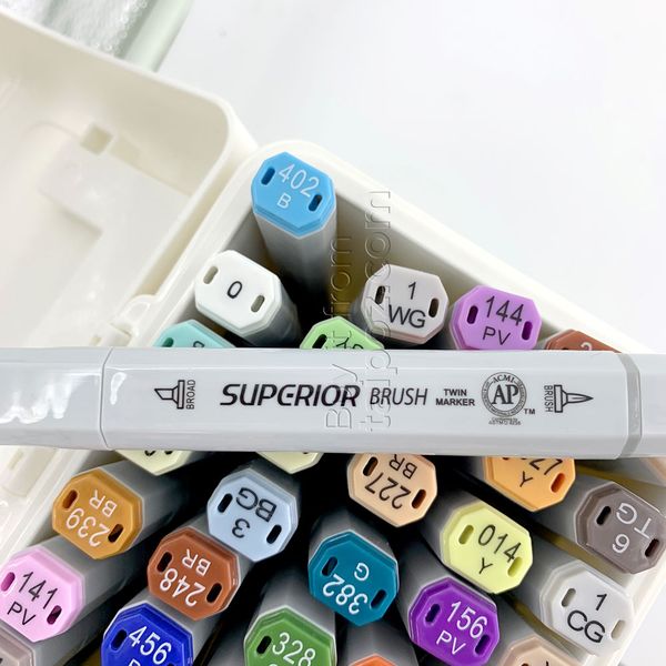 • Marker gốc cồn, một đầu brush, một đầu nét broad , dùng cho mọi nhu cầu vẽ marker. Khả năng đặc biệt của bút là lên màu trọn vẹn trong 01 lần tô, nên màu tô đều, mịn và không bị chồng nét. Lưu ý: Bút sẽ không dành cho người vẽ thích màu marker lên tông từ từ.