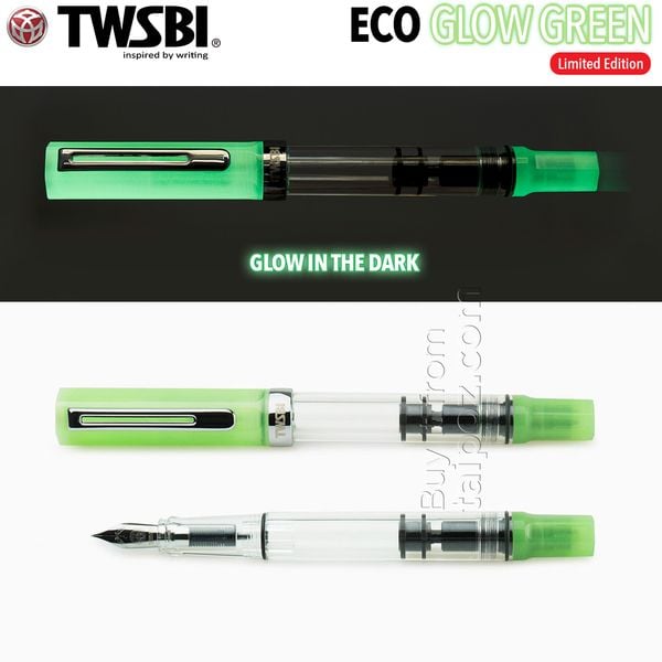 | Twsbi Eco Glow Green is a special version of one of the best seller fountain pen that features a green cap and piston knob that glow in the dark (expose it to sunlight, and watch it glow in the dark). Steel nib and piston filler mechanism.