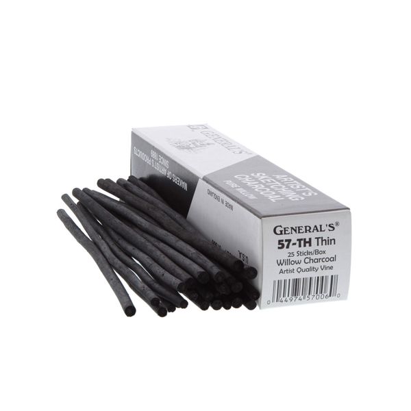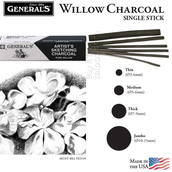 • These charcoal sticks are made of willow branches that have been burnt to a specific hardness. Unlike compressed charcoal, vine and willow charcoal doesn't use a binding agent which results in clean erasing. |