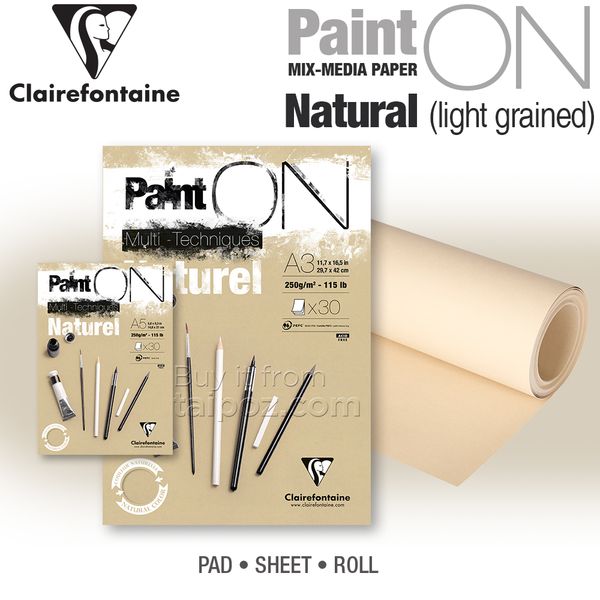 | • With its traditional know-how dated since the 17th century, Clairefontaine regularly innovates to offer up-to-date products that are essential to the needs of all artists. • The Paint'ON range papers are simply unique. Specially designed to meet quality requirements, they are perfectly suitable for dry techniques but will reveal their full potential with wet techniques such as gouache or acrylic. An excellent combination of techniques! This 250gsm mix-media paper dedicated to a large public of users no matter their skills will perfectly resist to scratching and repeated corrections. • Available in 4 distinct surfaces in white: smooth, recycle/satin, light grain & grained, it is also available in 5 trendy shades that will delight consumers: (Natural, Grey, Black, Grey Green, Denim). • Available in pads from A5 to A2 size, in reams with large sheets or in rolls.