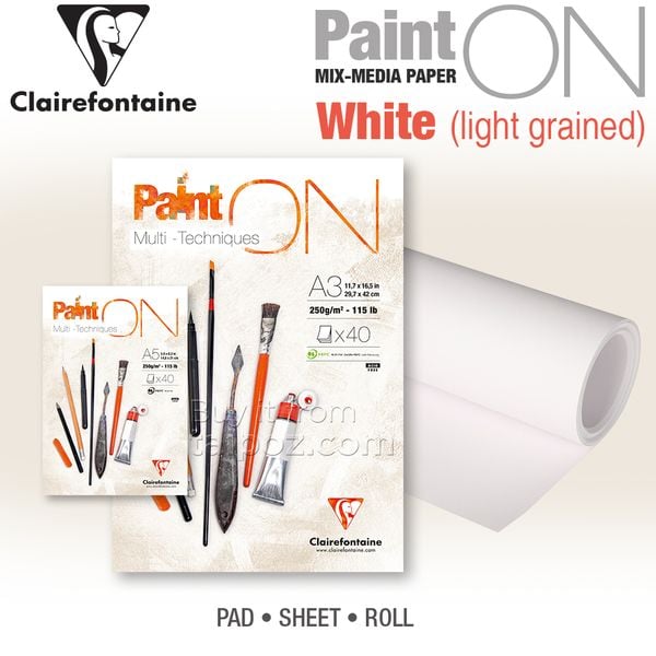 | • With its traditional know-how dated since the 17th century, Clairefontaine regularly innovates to offer up-to-date products that are essential to the needs of all artists. • The Paint'ON range papers are simply unique. Specially designed to meet quality requirements, they are perfectly suitable for dry techniques but will reveal their full potential with wet techniques such as gouache or acrylic. An excellent combination of techniques! This 250gsm mix-media paper dedicated to a large public of users no matter their skills will perfectly resist to scratching and repeated corrections. • Available in 4 distinct surfaces in white: smooth, recycle/satin, light grain & grained, it is also available in 5 trendy shades that will delight consumers: (Natural, Grey, Black, Grey Green, Denim). • Available in pads from A5 to A2 size, in reams with large sheets or in rolls.